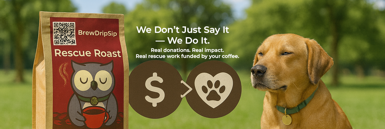 Each BrewDripSip purchase automatically contributes $1 to the International Fund for Animal Welfare (CRA #12993 1636 RR0001) — the first of many animal-rescue organizations we’ll support as our donation options expand.